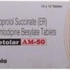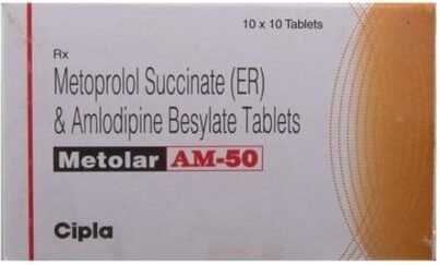 Metolar AM 50 Tablet contains two medicines, both of which help to control high blood pressure and heart rate. It is also used for heart-related chest pain, abnormal heart rhythms and chronic (long-term) heart failure.