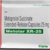 Metolar XT 25 Tablet belongs to a group of medicines called beta-blockers. It is used to treat high blood pressure (hypertension), angina (heart-related chest pain), and irregular heart rhythms (arrhythmia). It also helps to prevent migraines, future heart attacks, and stroke.